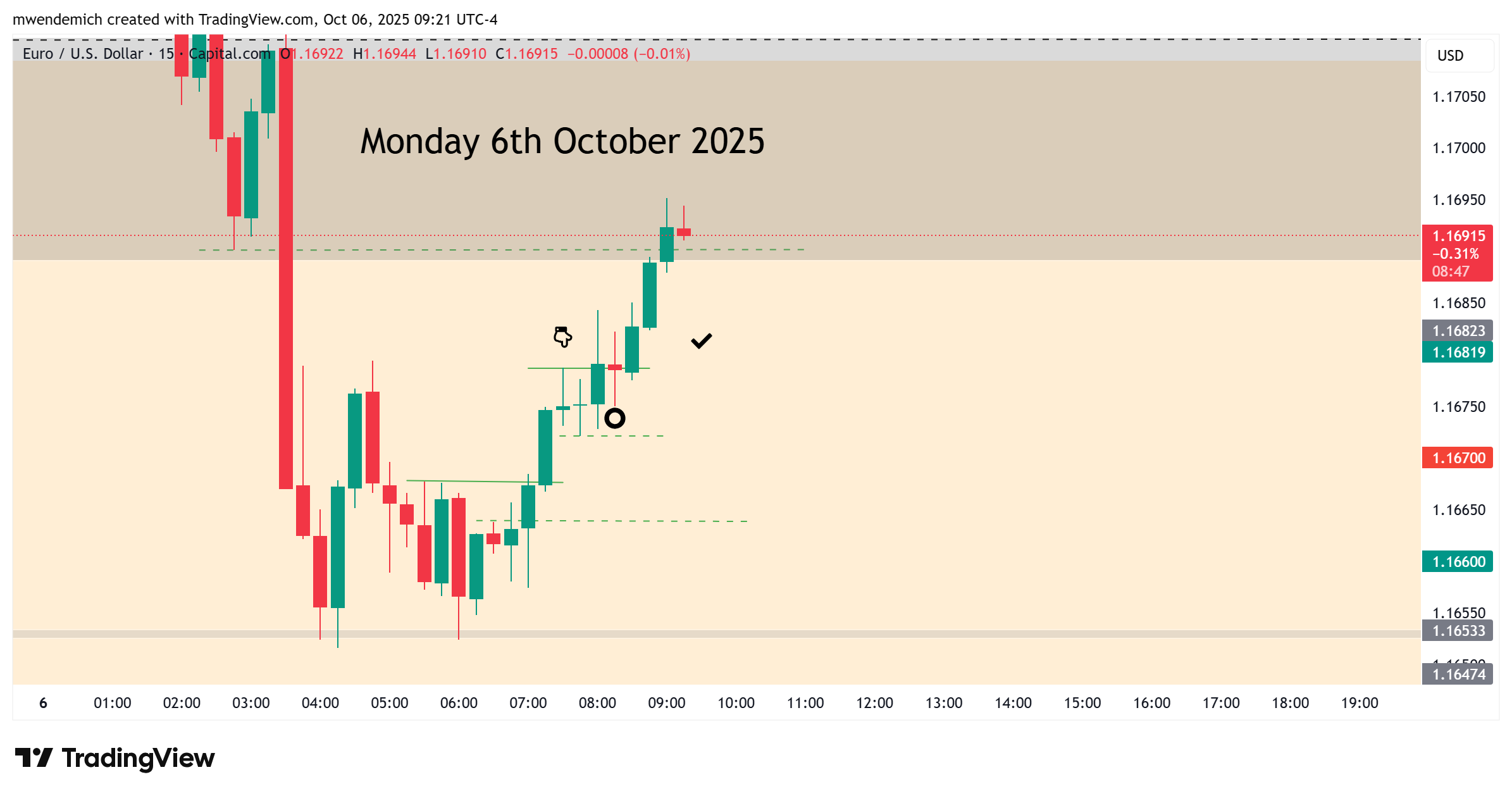 After the structure shift, don’t rush in immediately. Wait for price to retrace back to a 15-minute mitigation block — typically the origin of the move that caused the market structure shift. In the image above, price has shifted higher and closed above the swing high pointed by a hand. The price then retraces back and I look for buy setups on the candle with an 0 sign.